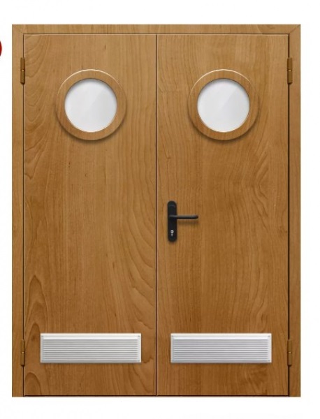 Дверь противопожарная без порога полуторная с квадратным стеклом