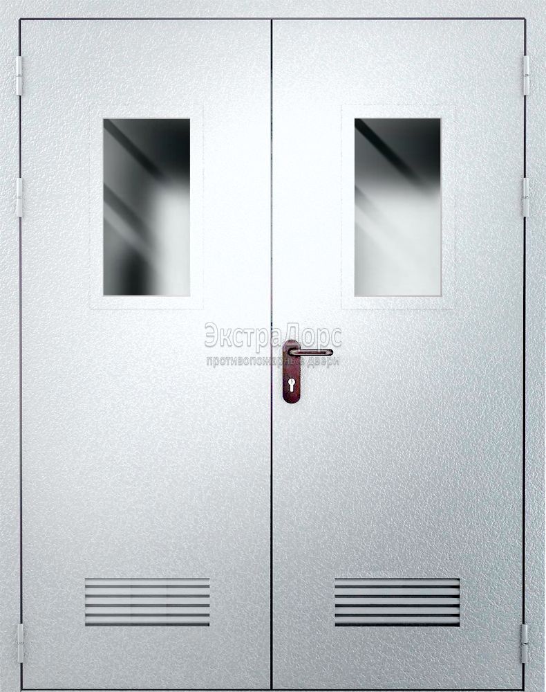 Двухстворчатая огнеупорная дверь EI 60 с выпадающим порогом, стеклом и решеткой в Коломне