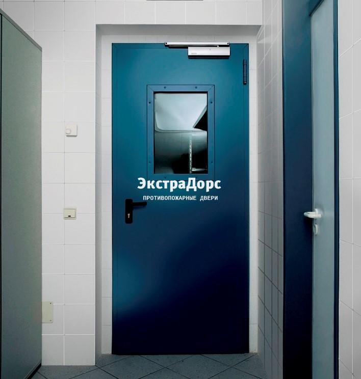 Противопожарная дверь 1 типа синяя c выпадающим порогом с остеклением в Коломне