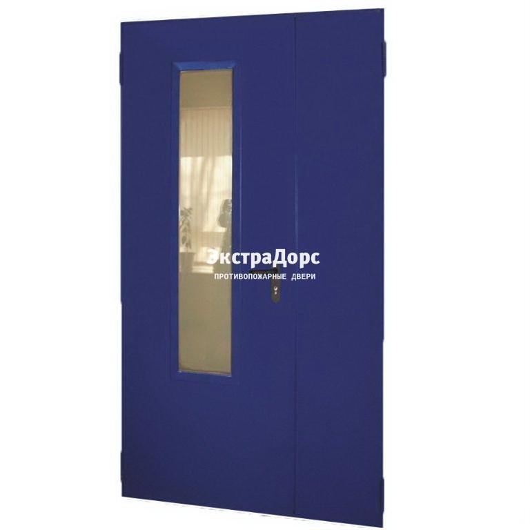 Дверь с выпадающим порогом противопожарная EI 90 двупольная синяя со стеклом в Коломне