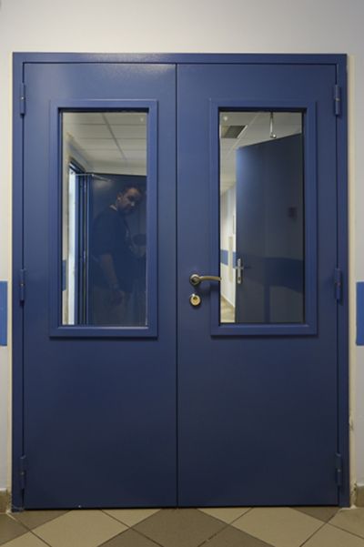 Противопожарная алюминиевая дверь синего цвета в Коломне
