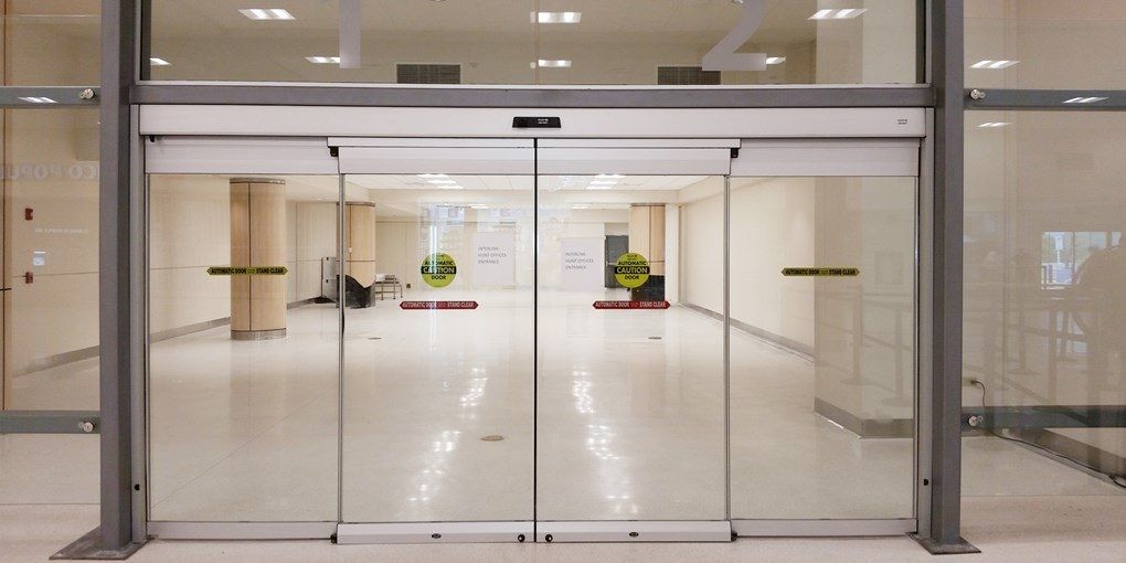 Противопожарная безрамная дверь со стеклом в бизнес центр в Коломне